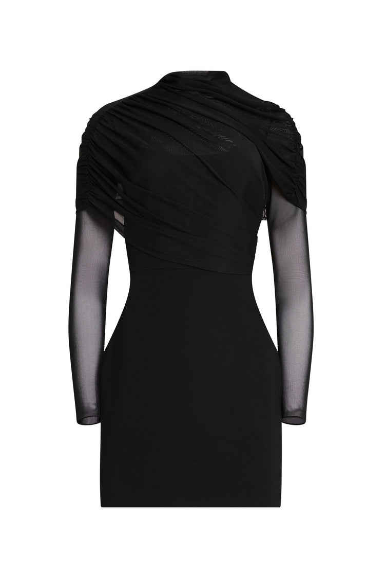 Elevate your look in the Rosalyn Dress. This mini features a sleek silhouette with long mesh sleeves and an elegant draping at the shoulders. Pair with pointed heels and a sparkly purse for a center-of-attention outfit.