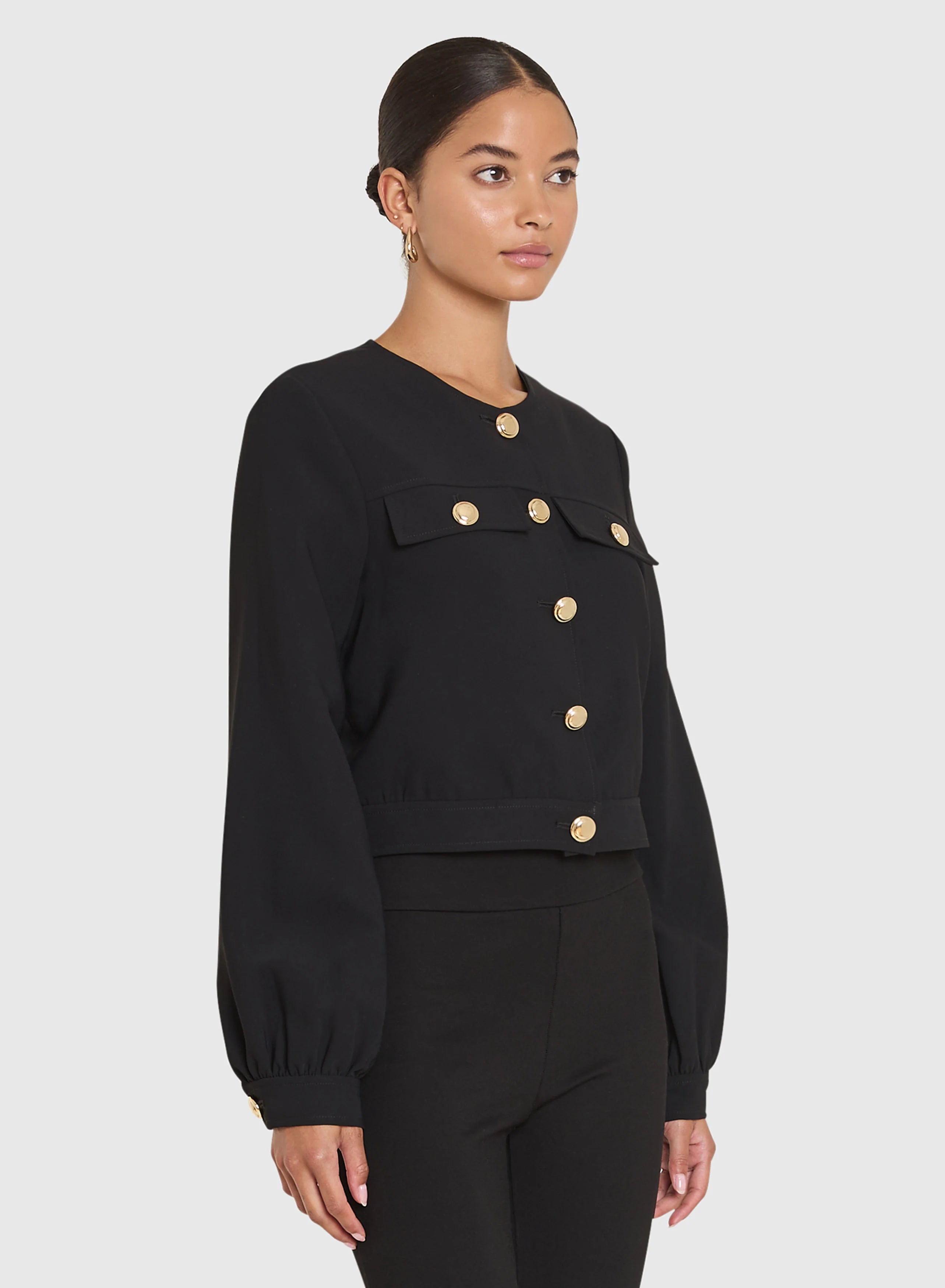 Nail the look in the Nina Jacket. With its vintage-inspired cut and bold gold buttons, this layer delivers cool, clean confidence. Pair with the Nina Skirt for a picture-perfect set.